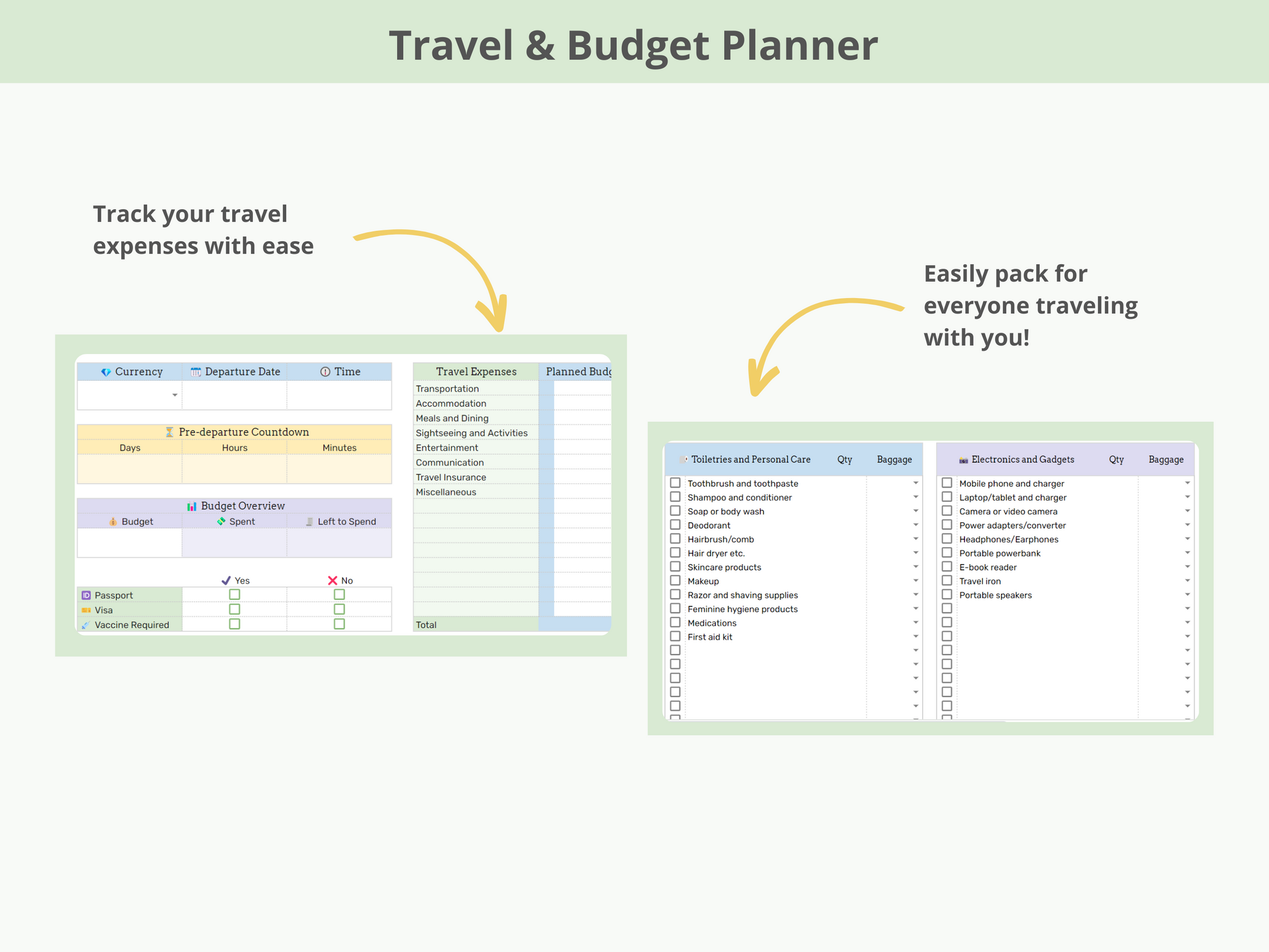 Designed with simplicity in mind, our Travel Budget and Planner Spreadsheet is an awesome tool for helping you experience unforgettable journeys. Whether you're embarking on a weekend getaway or a globetrotting adventure, our spreadsheet takes the stress out of travel planning.