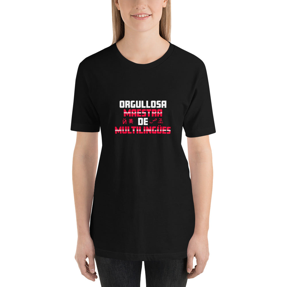 Celebrate your dedication as a teacher with our cozy "Orgullosa Maestra de Multilingües/Proud Multilingual Teacher" t-shirt! With its charming design and inspiring message, this t-shirt is perfect for educators who value linguistic diversity. Stay comfortable and showcase your commitment to multilingualism while inspiring your students to explore and love languages.